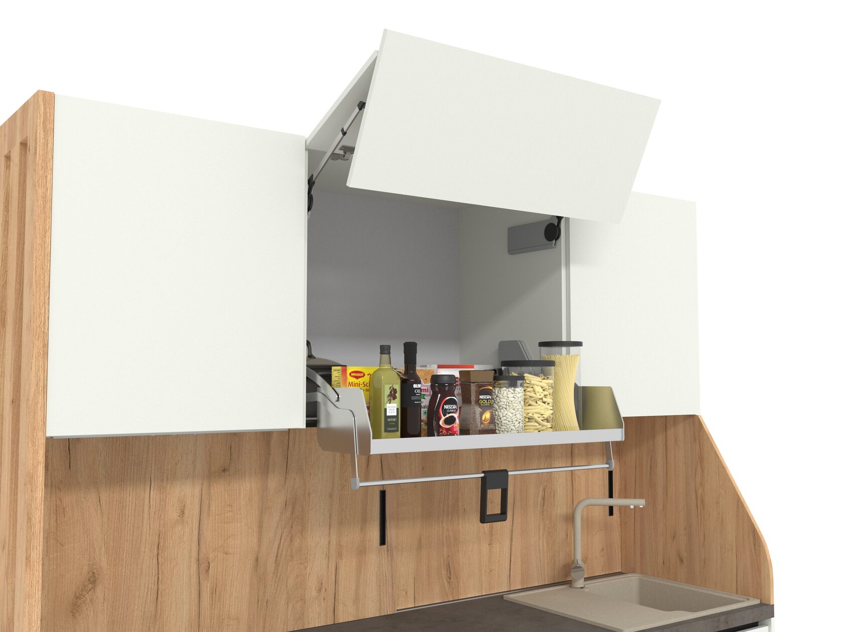 Угловые кухни «Компакт» (КУ1187 и КУ2155) оснащены большим количеством места под встраиваемую технику, а также полками и ящиками для хранения предметов и устройств. В качестве приятного бонуса идет зонирующая древесная рейка. Однако главной изюминкой такой кухни является выдвижной стол. Он находится на эргономичной высоте, рассчитанной на стандартные стулья. Выдвижной механизм работает мягко и бесшумно, надежно фиксируясь в разложенном состоянии. Поэтому столик можно использовать не только для обеда, но и для готовки в качестве дополнительной рабочей поверхности. Либо как рабочую зону под ноутбук или бумаги. Все благодаря надежному механизму-стопору, который фиксирует столик в неподвижном положении и не позволяет ему колебаться или трястись. Также эта модель, как и другие кухни «Abra mebel», оснащена цокольным ящиком немецкого производства. Положите в него противень, фольгу, бумагу, пленку и другие кухонные предметы – он вместит их всех.